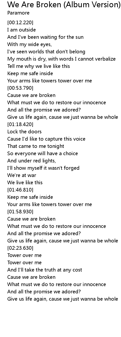 | [02:00.610] | Cause we are broken |