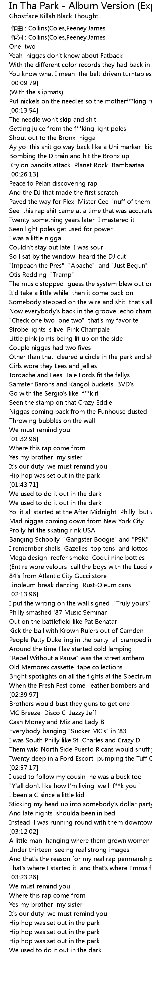 | [00:11.18] | Put nickels on the needles so the motherf**king record won't jump |