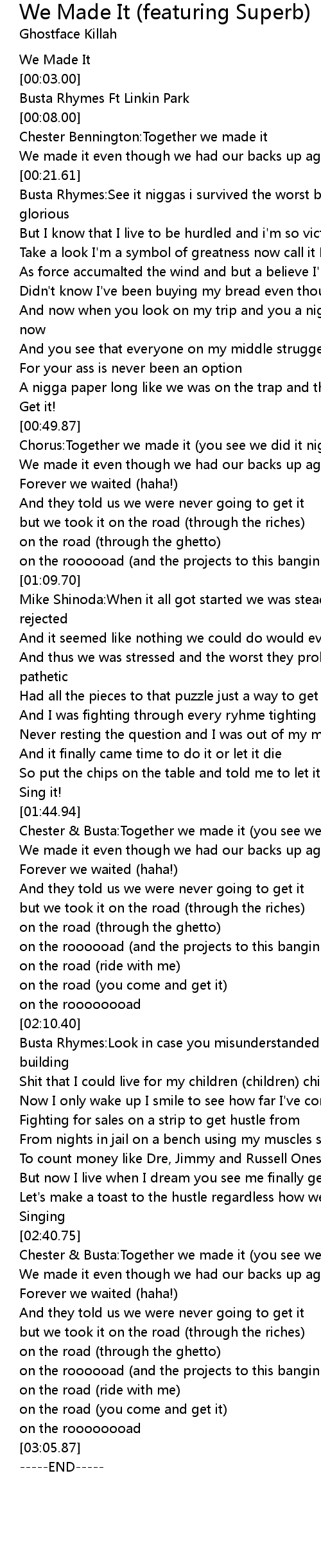 Chorus:Together we made it (you see we did it niggas) |