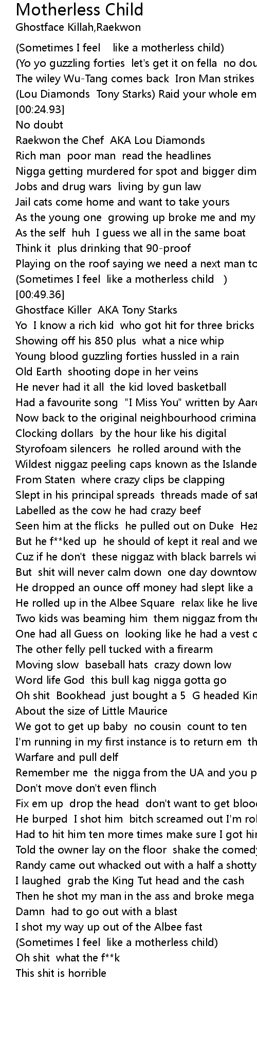 | [00:47.36] | (Sometimes I feel like a motherless child ) |