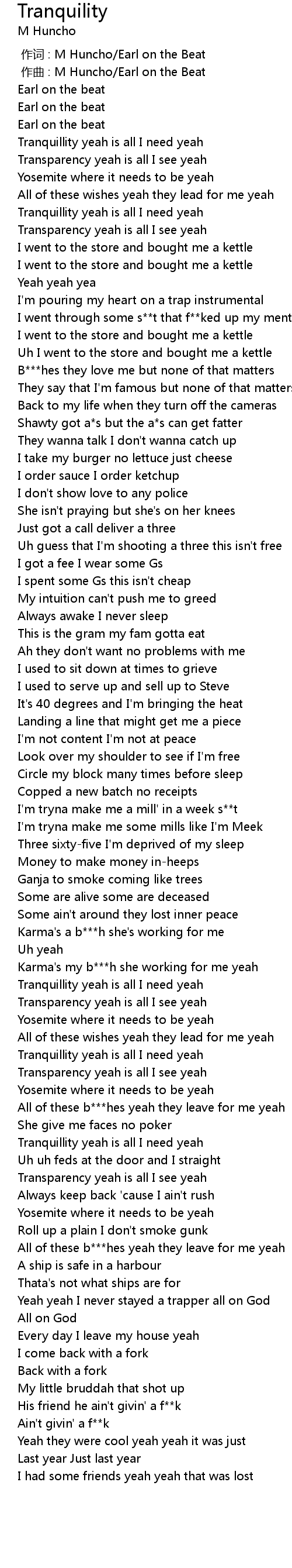 | [00:02.47] | Tranquillity yeah is all I need yeah |