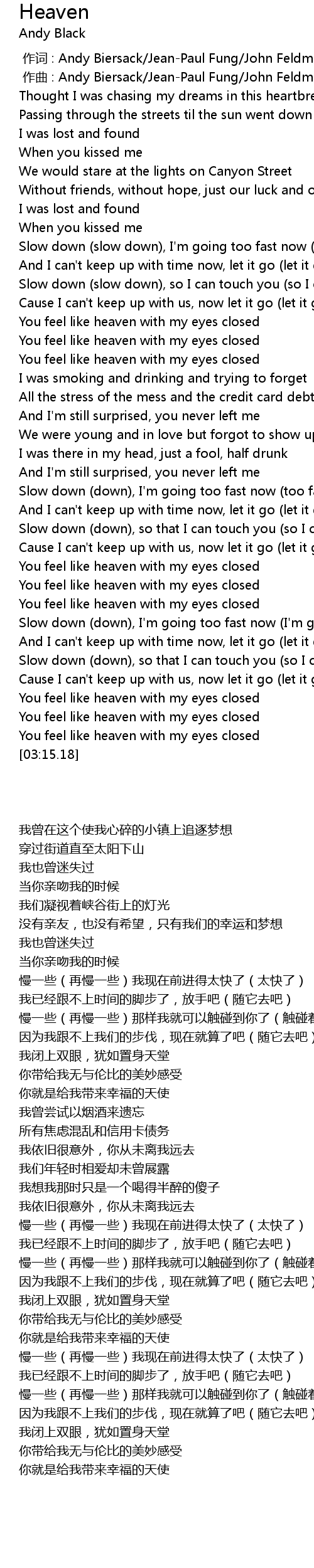 | [03:03.17] | You feel like heaven with my eyes closed |