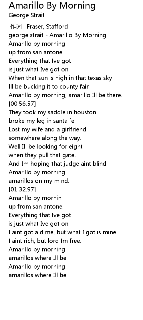 | [00:46.53] | Amarillo by morning, amarillo Ill be there. |