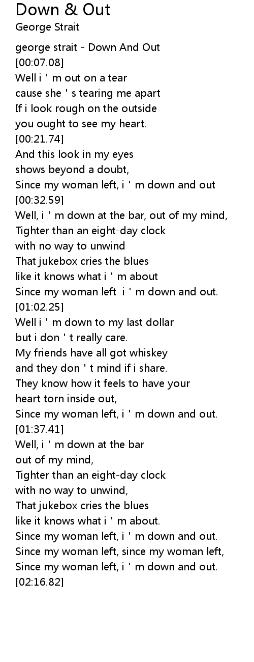 | [01:59.61] | Since my woman left, i'm down and out. |