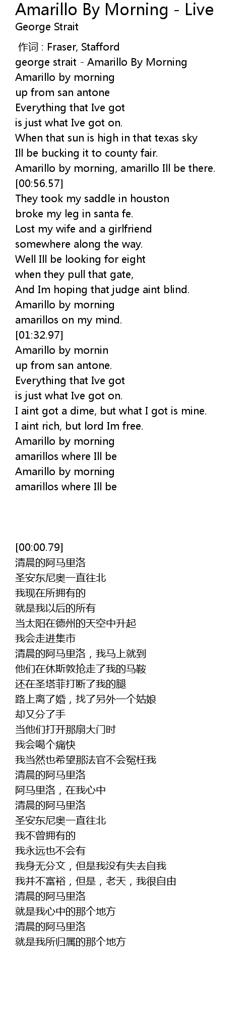 | [00:46.53] | Amarillo by morning, amarillo Ill be there. |