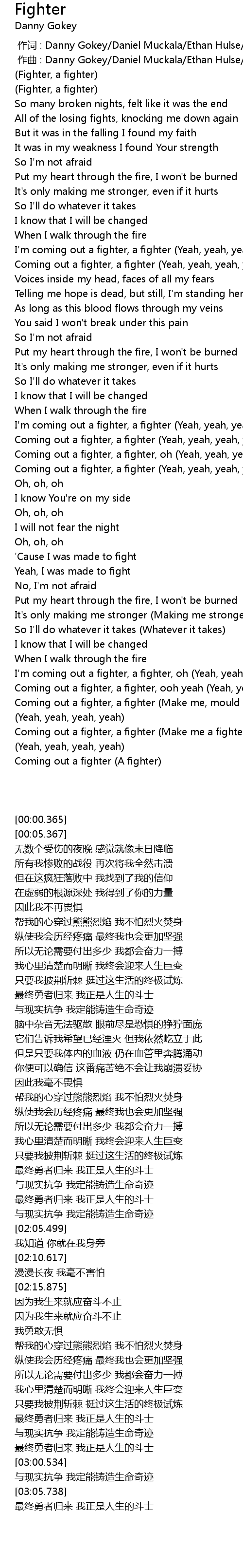| [02:45.933] | I' m coming out a fighter, a fighter, oh Yeah, yeah, yeah, yeah |