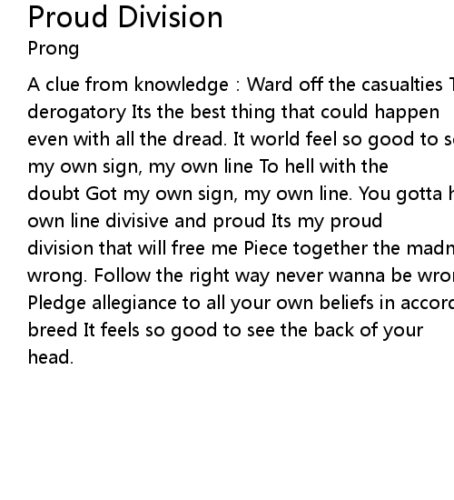 | division that will free me Piece together the madness with a clue to all the wrong. Follow the right way never wanna be wrong. | |
