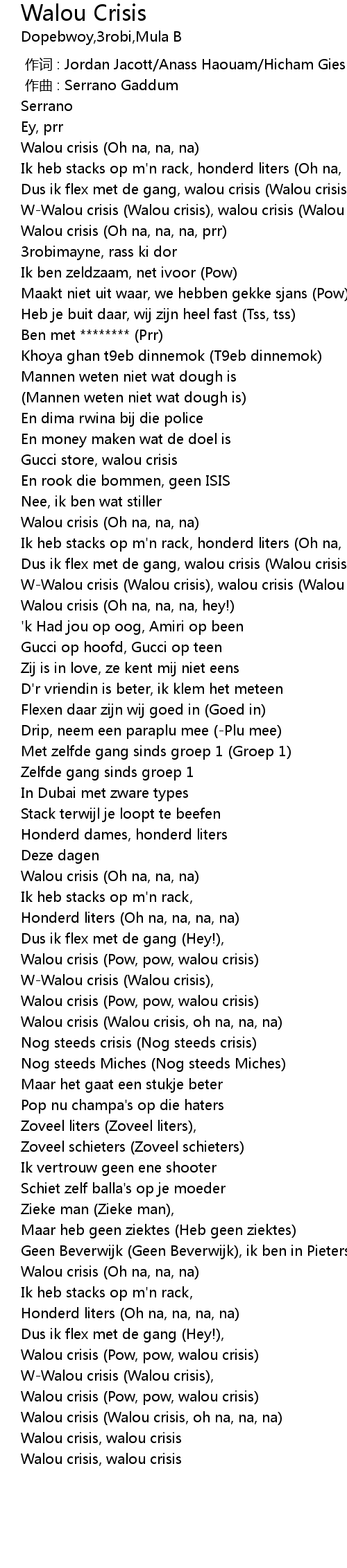 | [00:13.50] | Dus ik flex met de gang, walou crisis Walou crisis |
