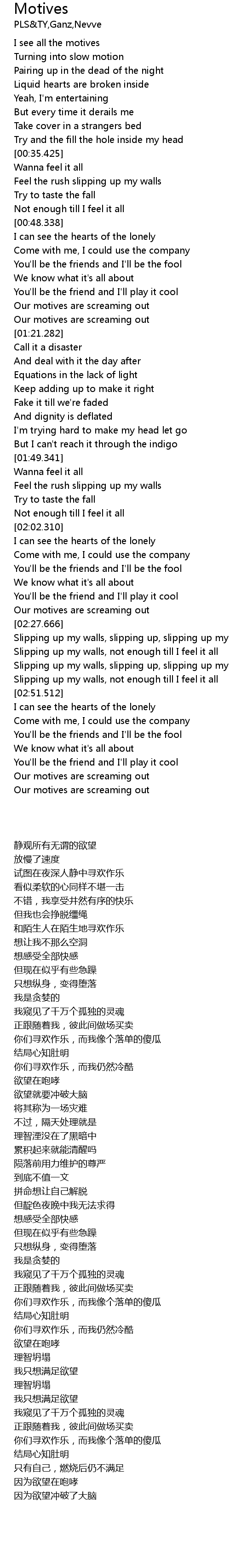 | [02:25.439] | Our motives are screaming out |