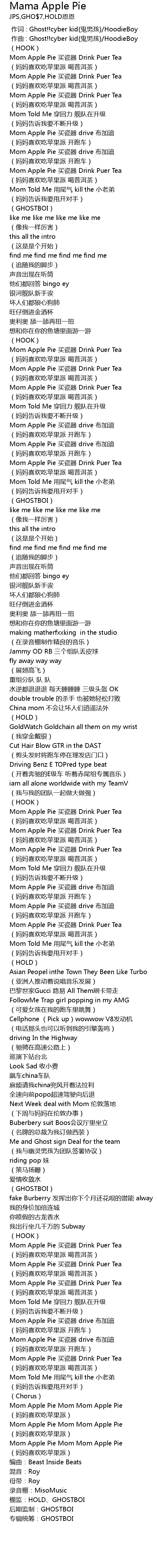 | [01:33.62] | Mom Apple Pie 买瓷器 drive 布加迪 |