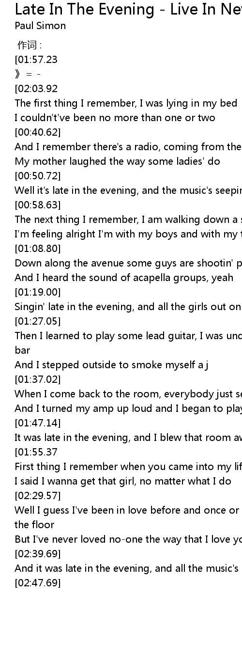 | [03:30.23][01:57.23][00:00.00] | Paul Simon Late In The Evening |