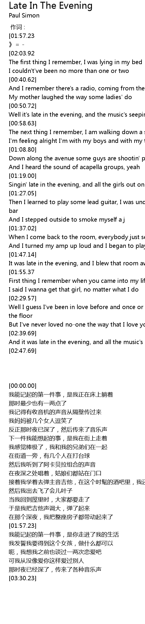 | [03:30.23][01:57.23][00:00.00] | Paul Simon Late In The Evening |