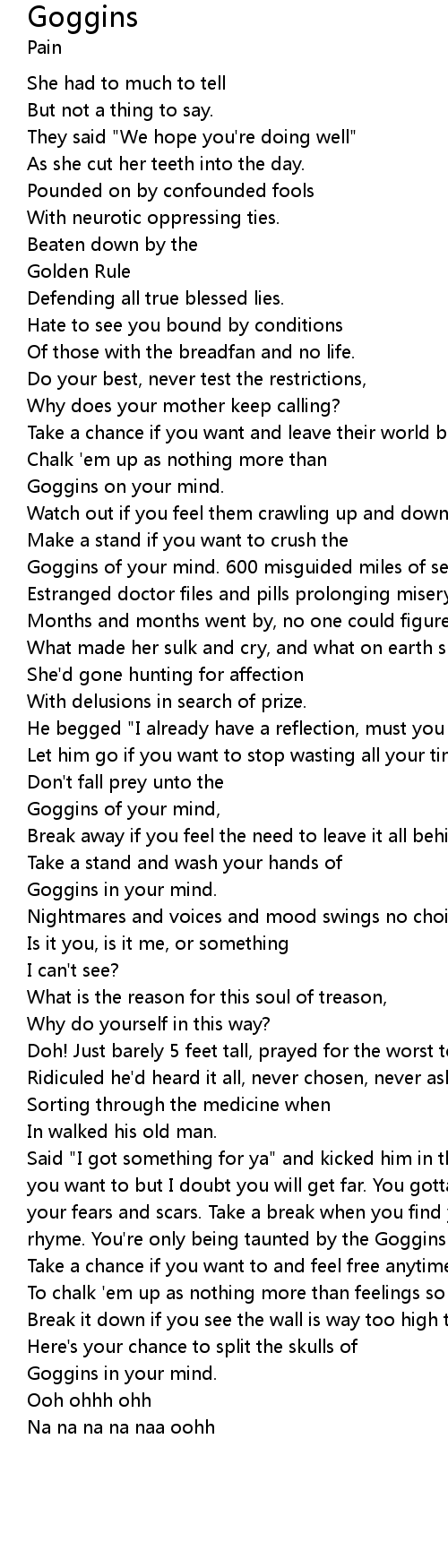 Said "I got something for ya" and kicked him in the cans. "Now you can run if you want to but I doubt you will get far. You gotta take it to the root of all your fears and scars. Take a break when you find you're losing all your cool and rhyme. You're only being taunted by the Goggins in your mind." |