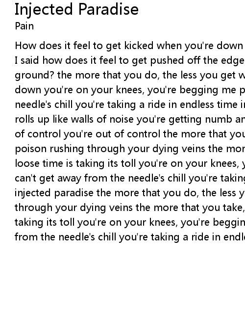 I said how does it feel to get pushed off the edge and just fall fall to the ground? the more that you do, the less you get why can't see you you're going down you're on your knees, you're begging me please can't get away from the needle's chill you're taking a ride in endless time injected paradise silence rolls up like walls of noise you're getting numb and deaf things are getting out of control you're out of control the more that you do, the less you get the poison rushing through your dying veins the more that you take, the more you loose time is taking its toll you're on your knees, you're begging me please can't get away from the needle's chill you're taking a ride in endless time injected paradise the more that you do, the less you get the poison rushing through your dying veins the more that you take, the more you loose time is taking its toll you're on your knees, you're begging me please can't get away from the needle's chill you're taking a ride in endless time injected paradise |
