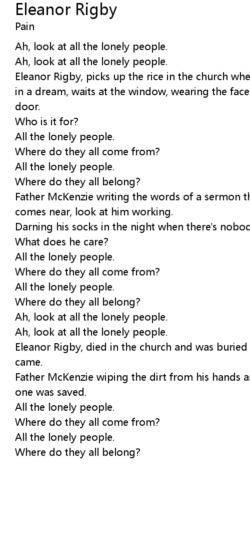 Eleanor Rigby, died in the church and was buried along with her name, nobody came. |