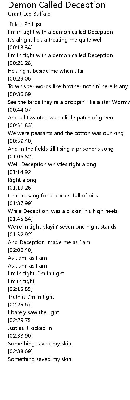 | [00:15.85] | I' m in tight with a demon called Deception |