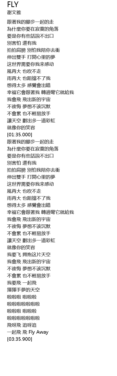 | [03:29.260] | 一起飛 飛 Fly Away |