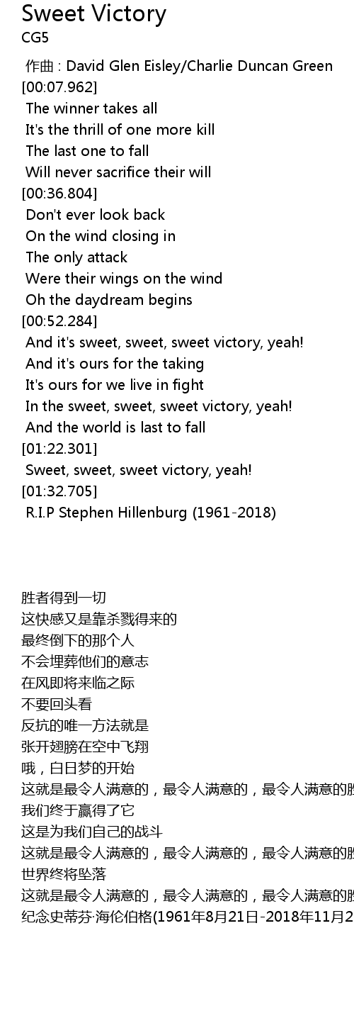 | [01:25.797] | Sweet, sweet, sweet victory, yeah! |