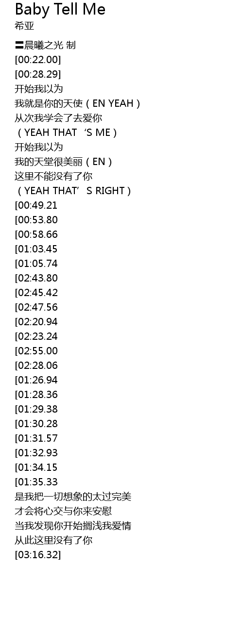 | [02:52.63][02:23.24][01:16.15] | BABY BABY TELL ME |
