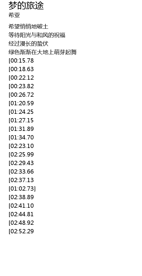 | [02:10.16][01:24.25][00:34.39] | 看梦想找寻着它的归宿 |