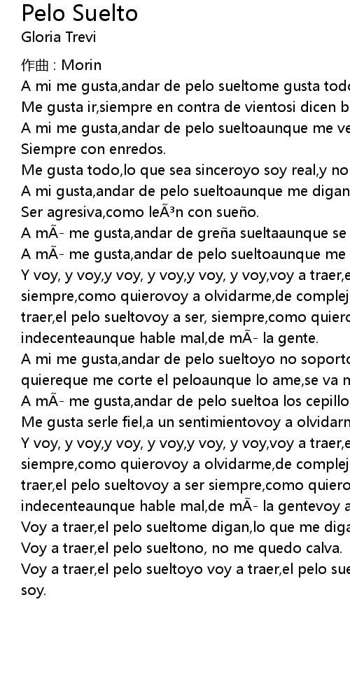 | Y voy, y voy, y voy, y voy, y voy, y voy, voy a traer, el pelo sueltovoy a ser siempre, como quierovoy a olvidarme, de complejosa nadie voy, a tener miedovoy a traer, el pelo sueltovoy a ser siempre, como quieroaunque me tachen, de indecenteaunque hable mal, de m la gentevoy a traer, el pelo sueltomjm! | |