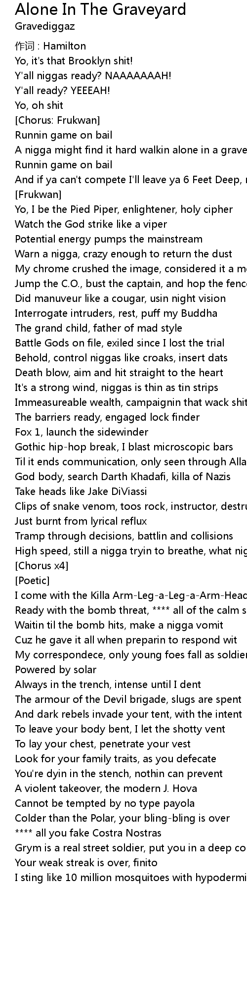 | A nigga might find it hard walkin alone in a graveyard | |
