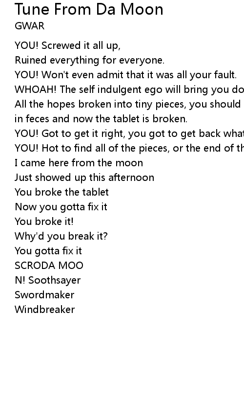 | All the hopes broken into tiny pieces, you should be kings, but you're wallowing in feces and now the tablet is broken. | |