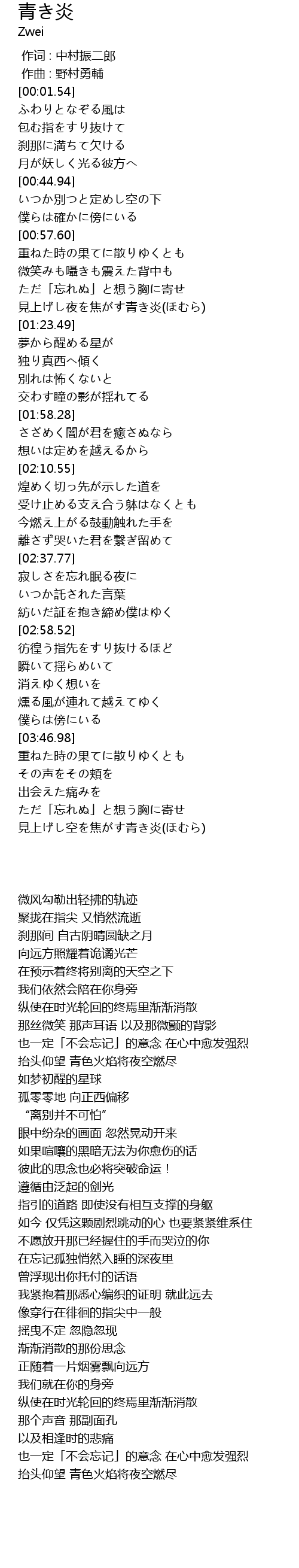 | [01:16.55] | 見上げし夜を焦がす青き炎(ほむら) |