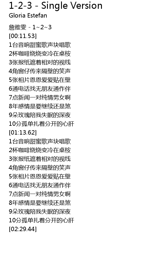 | [00:07.53] | 詹雅雯 - 1~2~3 |
