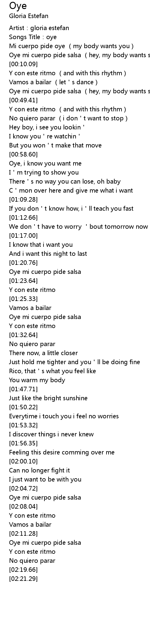| [00:01.46] | Mi cuerpo pide oye (my body wants you) |