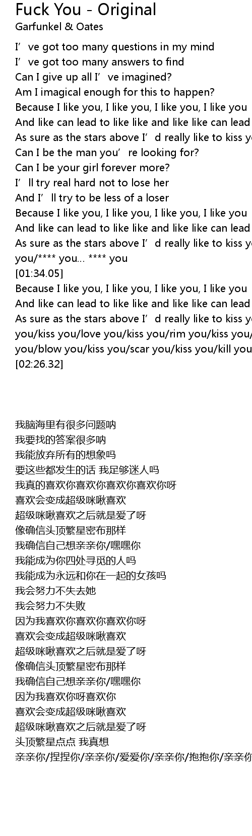 | [01:24.70] | As sure as the stars above I’d really like to kiss you/**** you/kiss you/**** you… **** you |