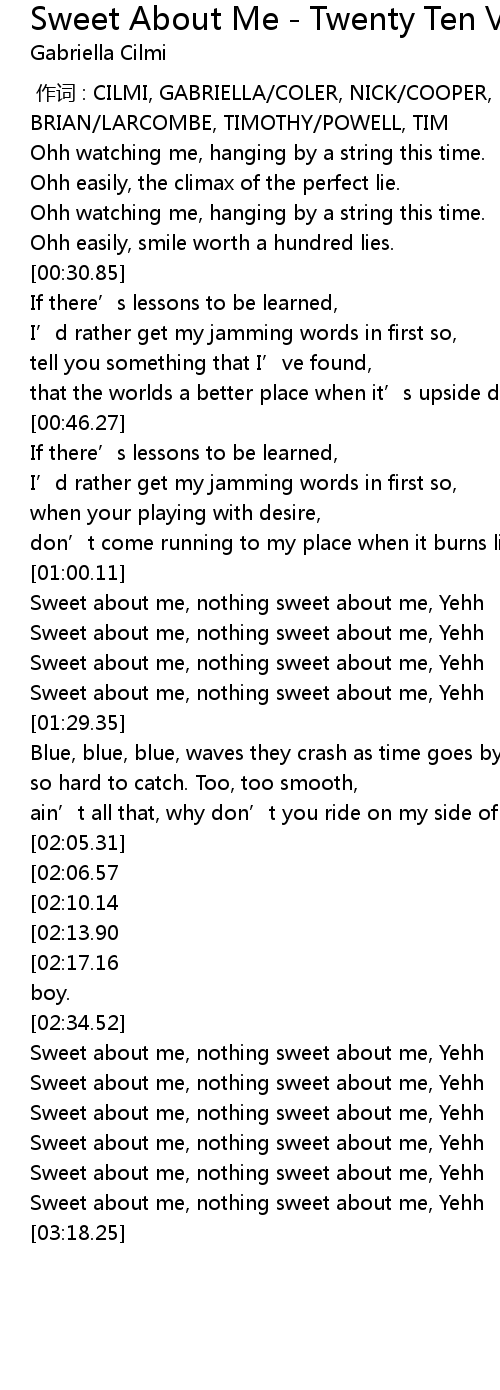 | [02:41.56] | Sweet about me, nothing sweet about me, Yehh |