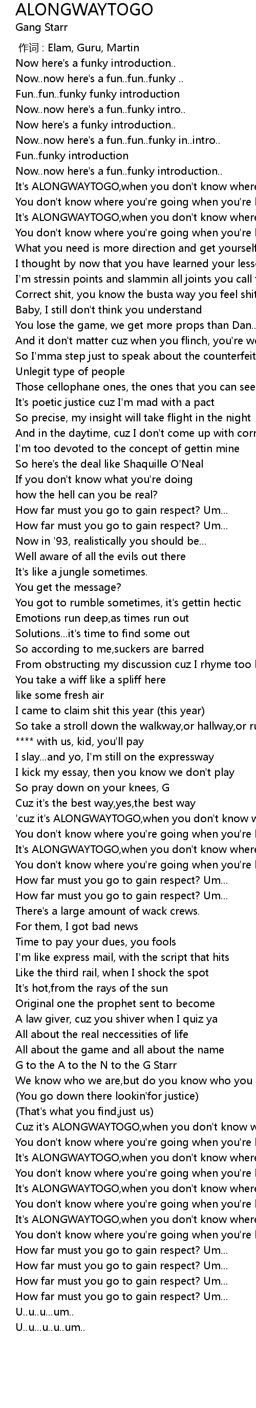 | [02:58.51] | Cuz it' s ALONGWAYTOGO, when you don' t know where you' re goin' |