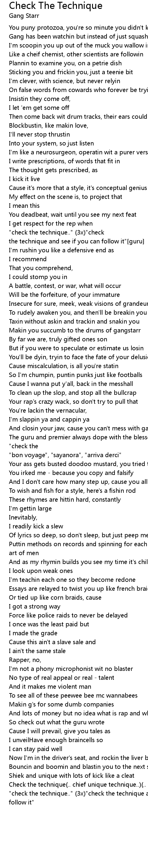 I speakCheck the technique[dj premier cuts]"check the technique.." (3x)"check the technique and see if you can follow it"[guru] |