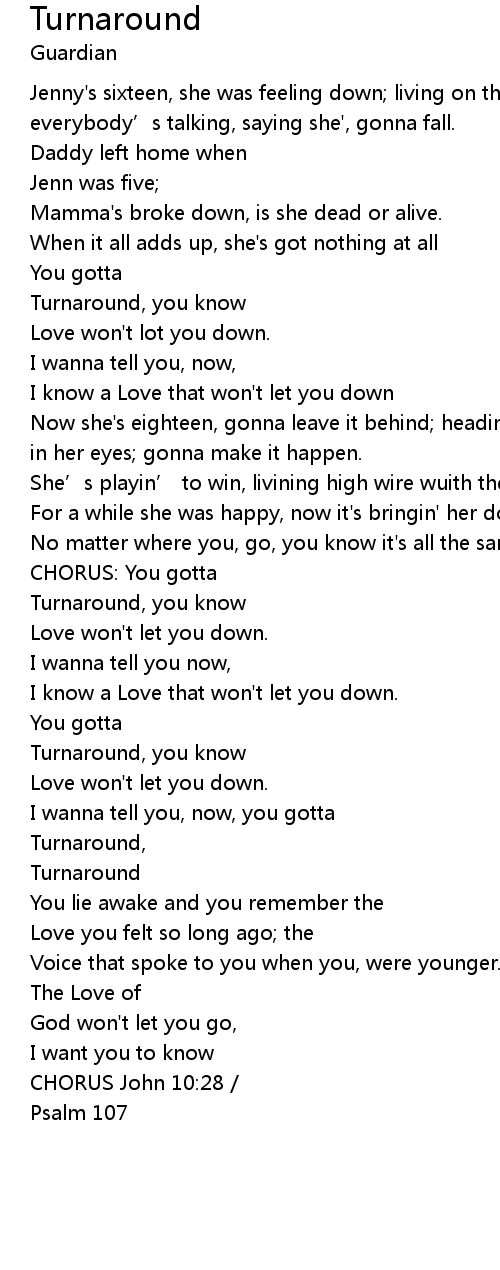 | Jenny's sixteen, she was feeling down; living on the edge in a dead end town; everybody’s talking, saying she', gonna fall. | |