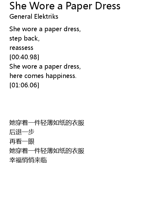 | [00:27.32] | She wore a paper dress, |