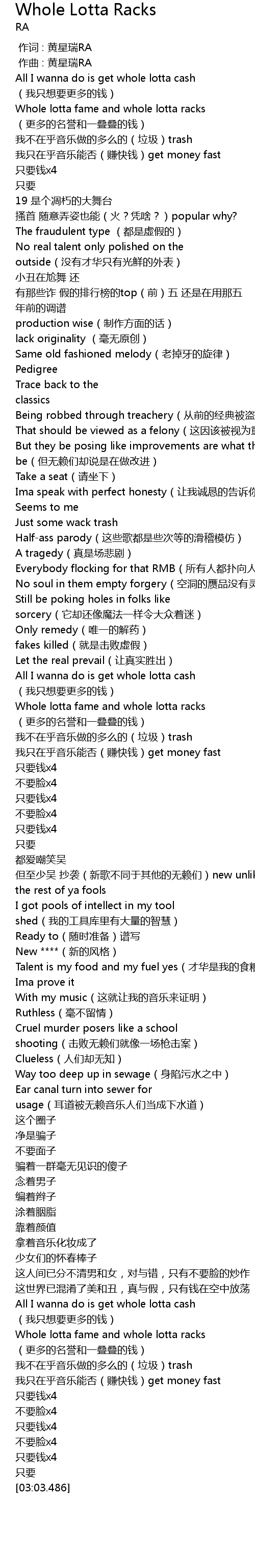 | [00:12.193] | Whole lotta fame and whole lotta racks |