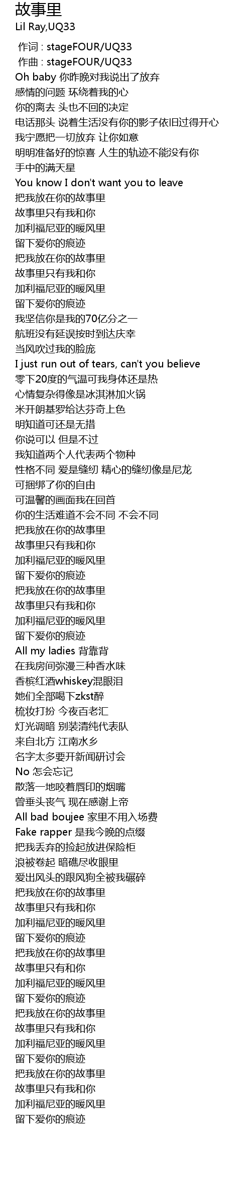 | [00:00.000] | 作词 : stageFOUR/UQ33 |