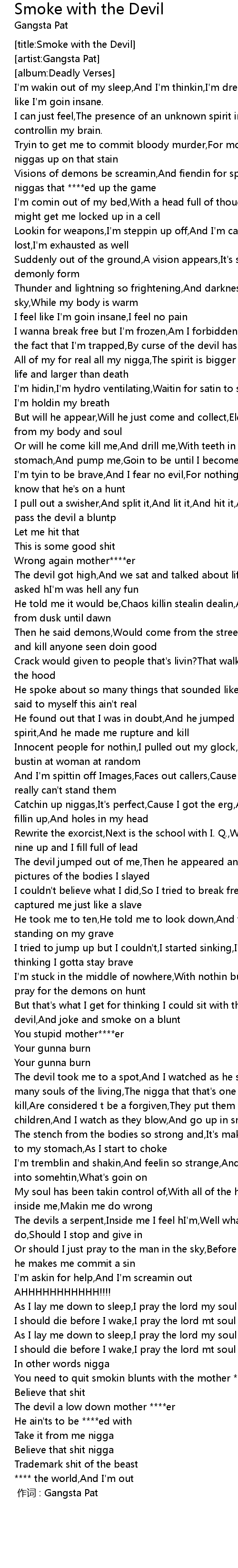 | [01:04:50-01:07:50] | I pull out a swisher, And split it, And lit it, And hit it, And pass the devil a bluntp |