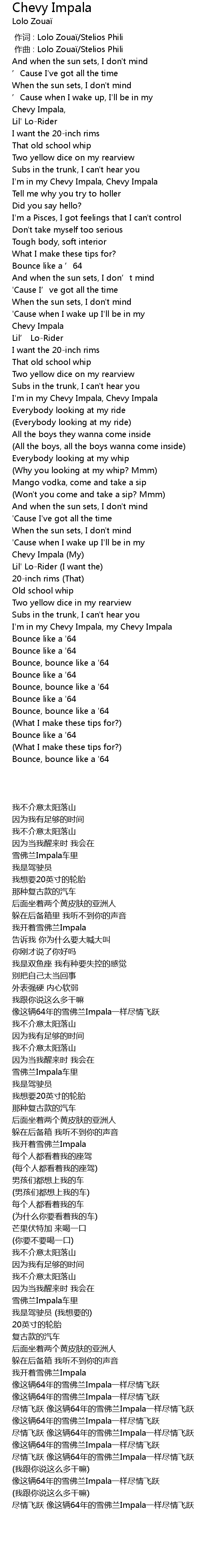 | [00:37.23] | I' m in my Chevy Impala, Chevy Impala |