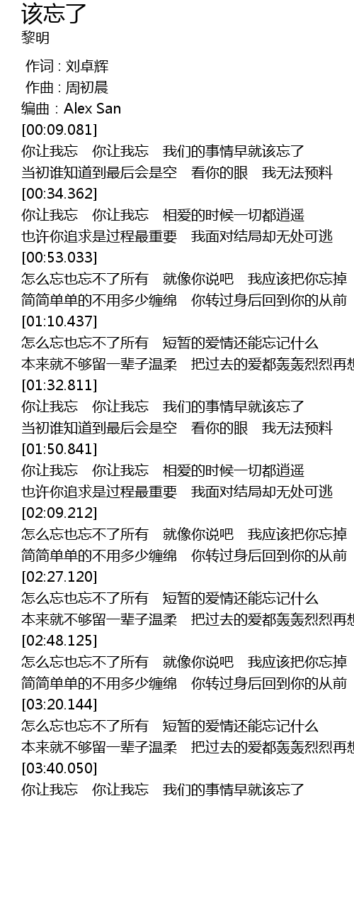 | [03:03.628] | 怎么忘也忘不了所有 就像你说吧 我应该把你忘掉 |