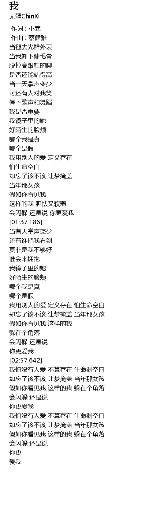 | [02:58.141] | 我怕没有人爱 不算存在 生命剩空白 |