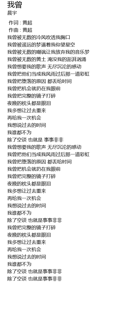 | [00:00.000] | 作词 : 黄超 |