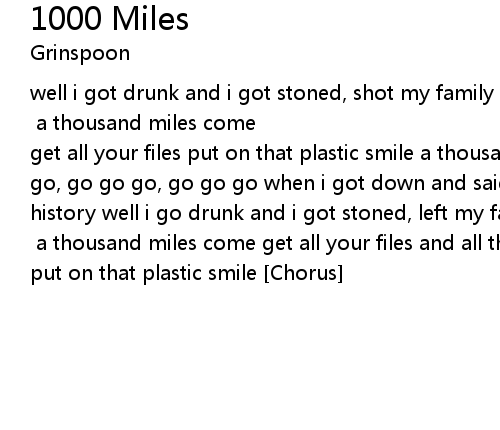 | well i got drunk and i got stoned, shot my family left my home went out on a killing spree cause what you did was ****ed to me [Chorus] a thousand miles come get all your files put on that plastic smile a thousand miles go go go, go go go, go go go, go go go when i got down and said to me she made me part of history well i go drunk and i got stoned, left my family all alone, go go go [Chorus] a thousand miles come get all your files and all that frequent smiles put on that plastic smile [Chorus] |