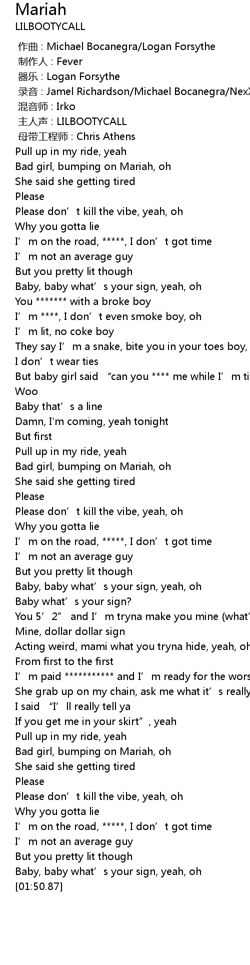| [00:52.76] | Bad girl, bumping on Mariah, oh |
