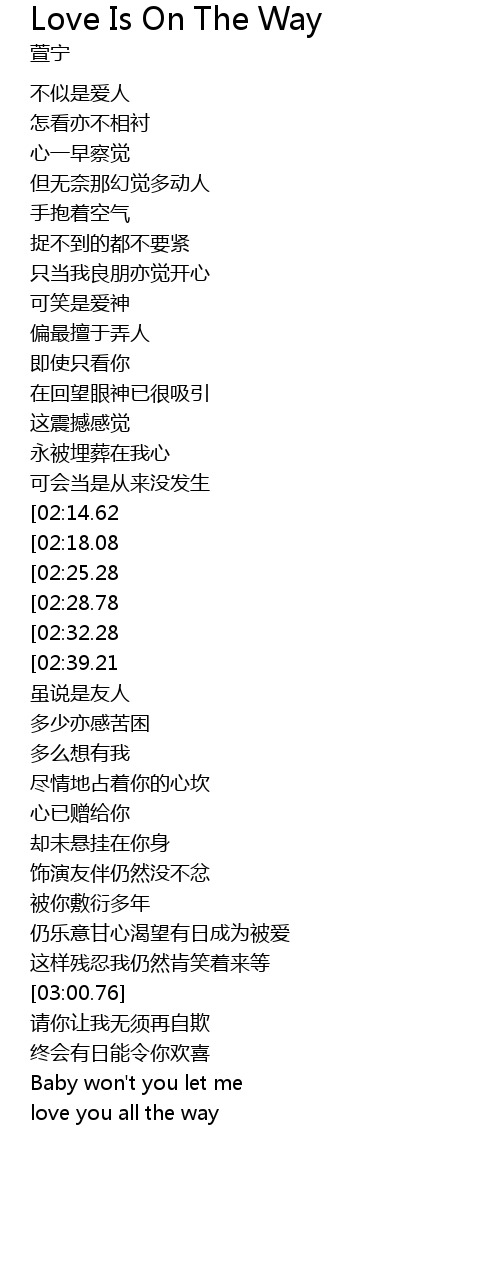 | [01:35.72][02:39.21][03:32.23] | Baby tell me love is on the way |