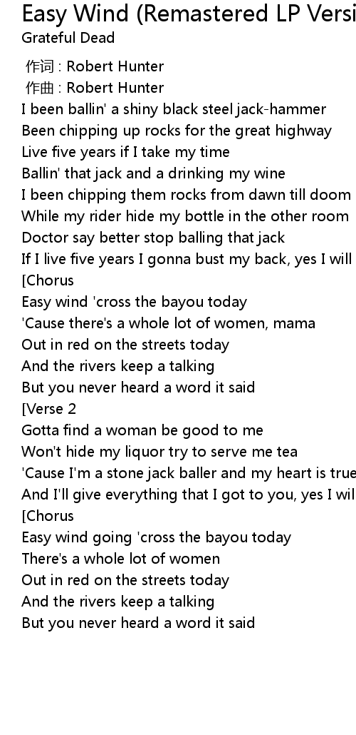 | [04:16.404] | Easy wind going 'cross the bayou today |