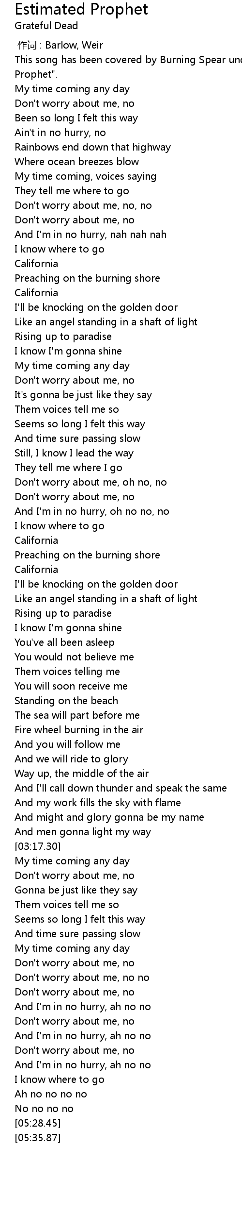 | [00:04.92] | This song has been covered by Burning Spear under the title "Estimated Prophet". |
