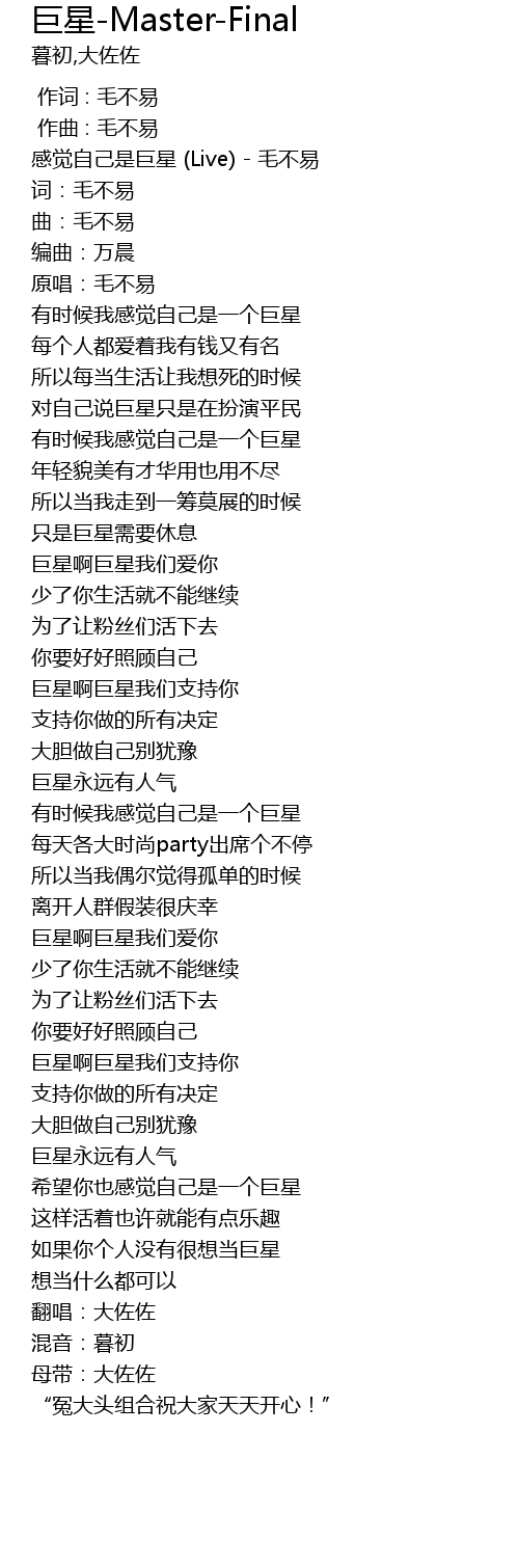 | [00:03.630] | 感觉自己是巨星 (Live) - 毛不易 |