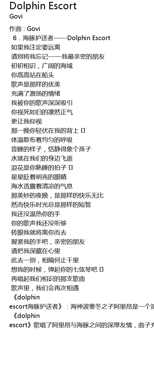 | 《dolphin escort》歌唱了阿里昂与海豚之间的深厚友情,曲子充满了友情愉悦的韵味,仿佛看到了阿里昂和海豚在一起乘风破浪的情景。 |